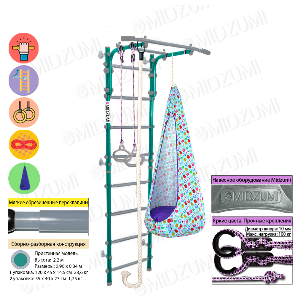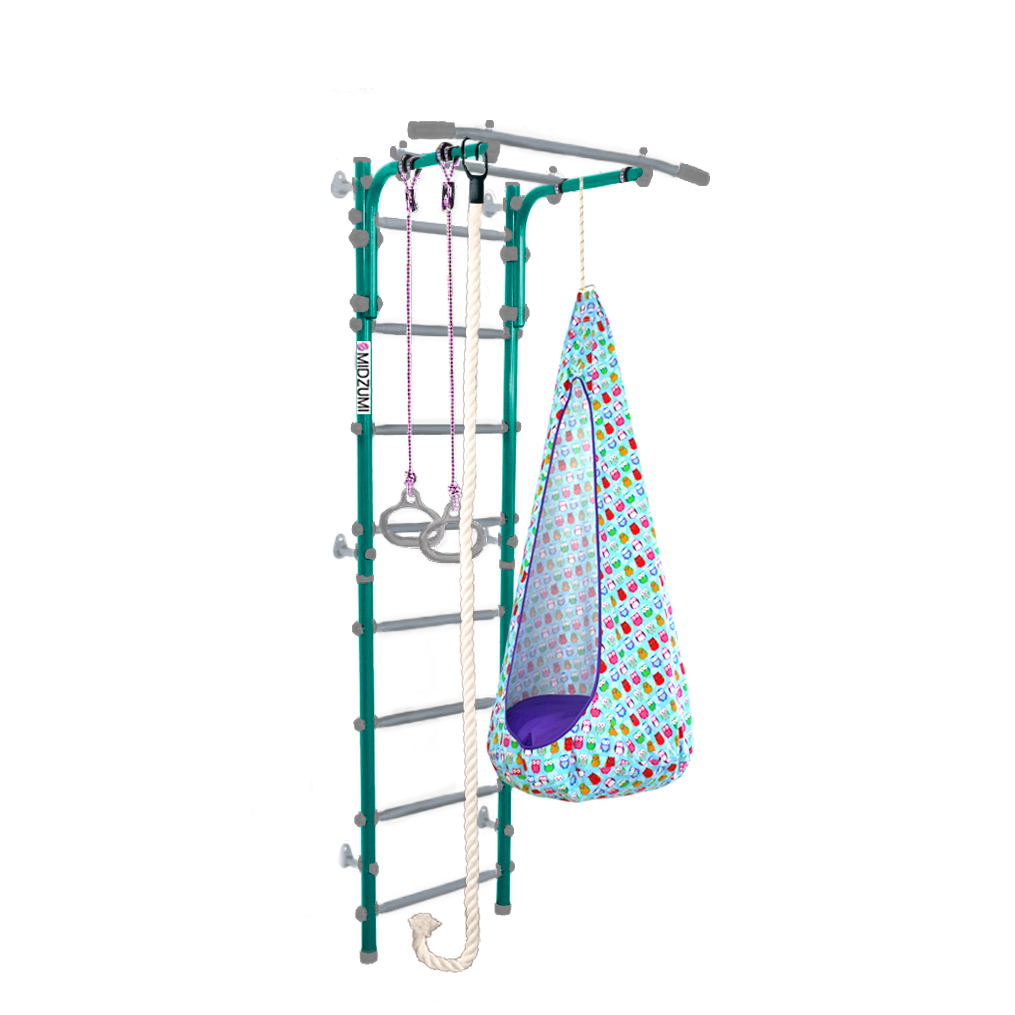 Комплектация: основа - металлическая шведская стенка с турником, гимнастические кольца, канат, качели-кокон.